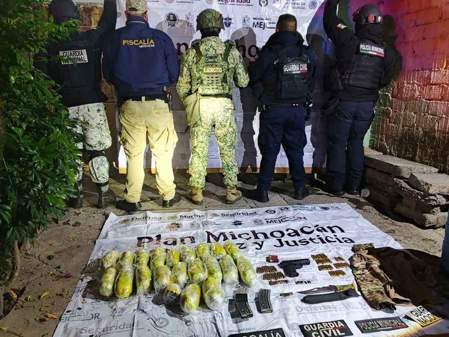 Zamora, Michoacán, 27 de enero del 2026.- Elementos de la Secretaría de Seguridad Pública (SSP) apoyaron a la Fiscalía General del Estado (FGE) en la cumplimentación de una orden de cateo en Zamora. En coordinación con la Secretaría de la Defensa Nacional (Defensa), la Guardia Nacional (GN) y la Policía Municipal, aseguraron cerca de nueve kilogramos de mariguana, una réplica de arma de fuego y 109 cartuchos útiles.