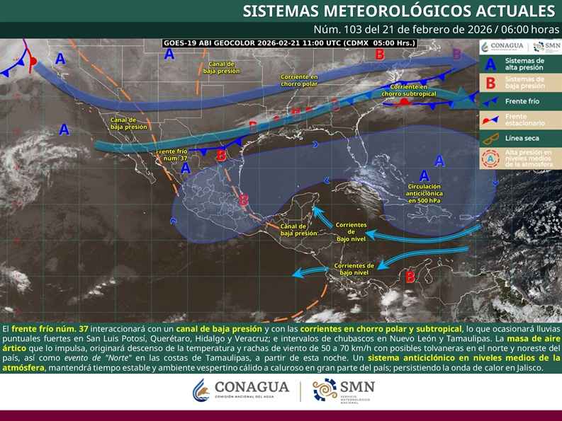 Ciudad de México a 21 de Febrero del 2026.- Para hoy, el frente frío núm. 37 se desplazará sobre el noreste de México, interaccionará con un canal de baja presión que se extenderá a lo largo de la Sierra Madre Oriental, y las corrientes en chorro polar y subtropical, ocasionarán lluvias puntuales fuertes en San Luis Potosí, Querétaro, Hidalgo y Veracruz e intervalos de chubascos en Nuevo León y Tamaulipas. La masa de aire ártico que impulsará al frente frío, originará un marcado descenso de la temperatura en los estados del norte y noreste del país, así como vientos con rachas de 50 a 70 km/h y posibles tolvaneras en Durango, Coahuila, Nuevo León, Tamaulipas y San Luis Potosí. Mientras que, por la noche y primeras horas del domingo, dará inicio un evento de «Norte» fuerte con rachas de 50 a 70 km/h en las costas de Tamaulipas. Una circulación del sistema anticiclónico en niveles medios de la atmósfera, mantendrá tiempo estable, y ambiente vespertino cálido a caluroso en gran parte del país; persistiendo la onda de calor en Jalisco.