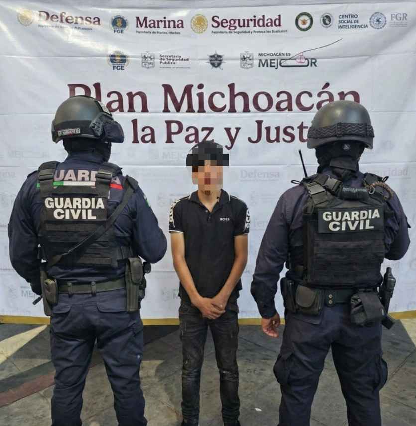 Morelia, Michoacán, 1 de marzo de 2026.- Derivado de las acciones operativas que se mantienen de manera permanente en la región de Tierra Caliente, elementos de la Guardia Civil aseguraron en el municipio de Aguililla a un adolescente en posesión de diversas dosis de sustancia, al parecer droga, y quien, de acuerdo a indicios estaría presuntamente relacionado con los hechos violentos registrados el pasado domingo en esta zona, donde se reportaron incendios de vehículos e inmuebles.