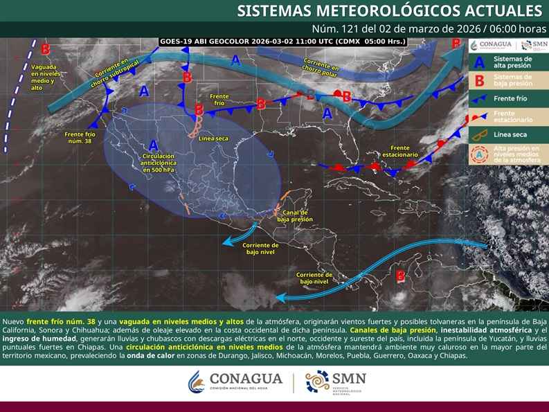 Ciudad de México a 02 de Marzo del 2026.- Este día, un nuevo frente frío núm. 38 sobre el noroeste mexicano, interaccionará con una vaguada en niveles medios y altos de la atmósfera, originando vientos con rachas de 50 a 70 km/h y posibles tolvaneras en la península de Baja California, Sonora y Chihuahua; además de oleaje de 1.5 a 2.5 metros de altura en la costa occidental de dicha península. Simultáneamente, canales de baja presión en el interior del país, en combinación con inestabilidad atmosférica y el persistente ingreso de humedad, generarán lluvias y chubascos con posibles descargas eléctricas en el norte, occidente y sureste del país, incluida la península de Yucatán, así como lluvias puntuales fuertes en Chiapas. Finalmente, una circulación anticiclónica en niveles medios de la atmósfera mantendrá ambiente muy caluroso en la mayor parte del territorio mexicano, prevaleciendo la onda de calor en Durango (oeste), Jalisco (centro-sur), Michoacán (centro y suroeste), Morelos, Puebla (suroeste), Guerrero (centro y este), Oaxaca (sur y este) y Chiapas (oeste).