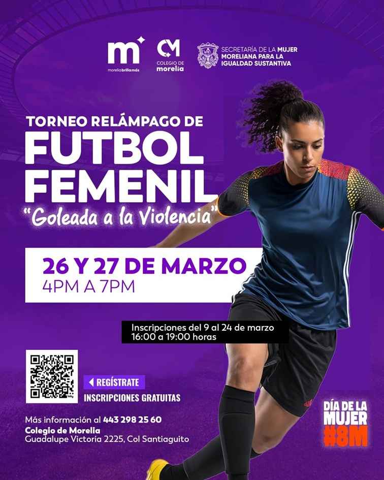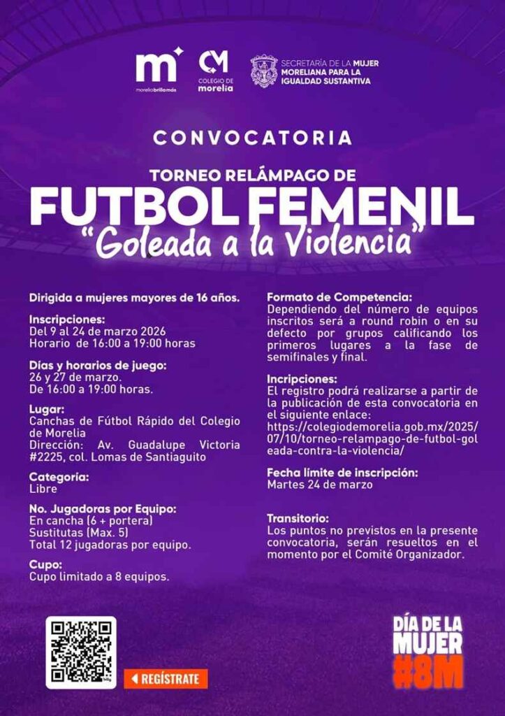 Morelia, Michoacán; 13 de marzo de 2026.- En el marco de la conmemoración del Día Internacional de la Mujer (8M), el Gobierno de Morelia invita a participar en el torneo relámpago de fútbol femenil “Goleada a la Violencia”, iniciativa que busca promover el deporte, la convivencia y espacios seguros para las mujeres en la capital michoacana.