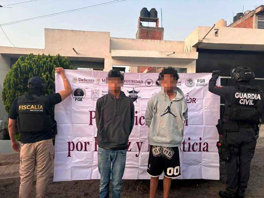 Durante estas acciones operativas, en Morelia, en la colonia Margarita Maza de Juárez, fue detenido Paulo César “N”, de 43 años de edad; en el lugar se aseguraron 2 armas largas y cartuchos, sustancia con las características de narcótico, teléfonos celulares, documentación relacionada con el cobro de cuotas a pipas y camiones de bancos de arena, 3 vehículos, una motocicleta, una cuatrimoto y un chaleco táctico con logotipos de FGE y FGR.